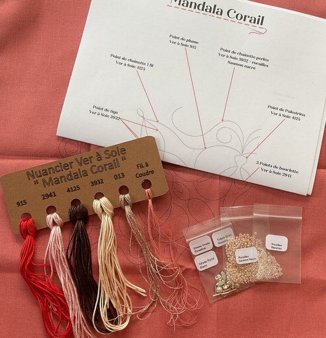 - Kit complet (Standard) : cette option comprend le modèle imprimé sur de la percale de coton Bio en couleur à l'encre indélébile, la fiche technique avec un pas à pas des points avec photos, la quantité de fils nécessaire, le strass, les perles, les tubes et les aiguilles. Ce modèle est brodé avec de la Soie d'Alger au Ver à Soie.